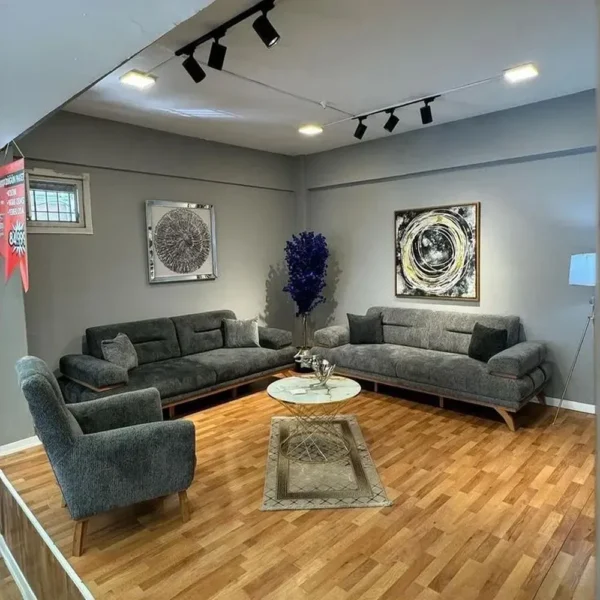 Designed for the ultimate modern lounge, this sofa set uses textured grey boucle fabric for a cozy yet upscale feel. The clean lines are accented by a thin gold trim at the base, making it a perfect fit for high-ceiling apartments and minimalist living spaces.