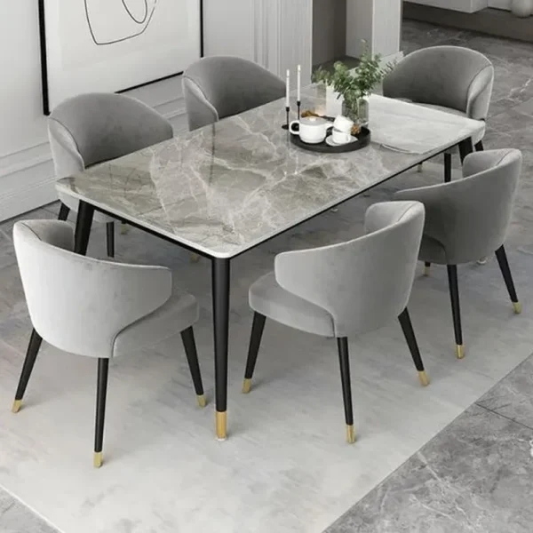 This dining set defines contemporary elegance. The smooth marble-patterned table is paired with ergonomic grey velvet chairs featuring striking gold-tipped legs, creating a perfect balance of luxury materials and modern silhouettes.