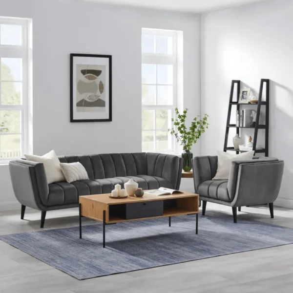Contemporary Grey Velvet Fluted Sofa and Armchair Living Room Set
