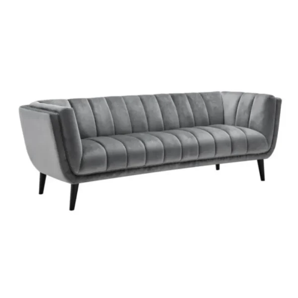 This modern living room ensemble features a sophisticated grey velvet finish with elegant vertical fluting. The deep-seated cushions and low-profile black legs create a contemporary silhouette that fits perfectly in any minimalist or modern home.