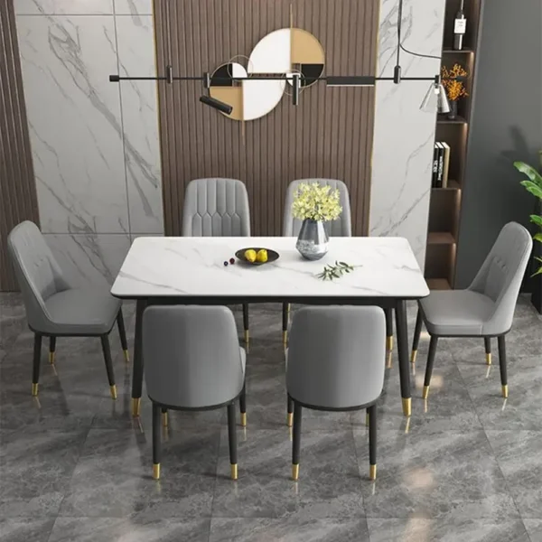 Elevate your dining experience with this luxury 6-seater ensemble. The centerpiece is a stunning white marble-patterned table supported by slim black legs. Complementing the table are six grey velvet chairs, featuring a unique quilted stitching pattern and gold-accented feet that add a touch of glamour to the modern design.