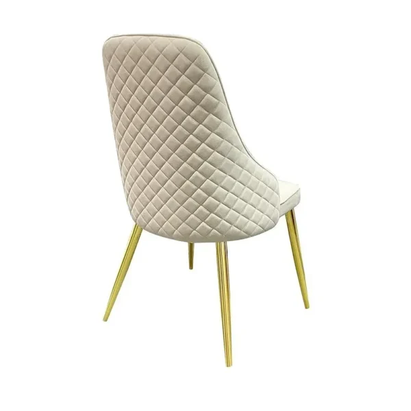 Enhance your dining experience with this luxury dining chair. Wrapped in high-quality white Leather Rite, it features a beautiful diamond-quilted pattern on the backrest. The gold-polished legs provide a stable and glamorous foundation, perfect for modern dining rooms or as an accent vanity chair.
