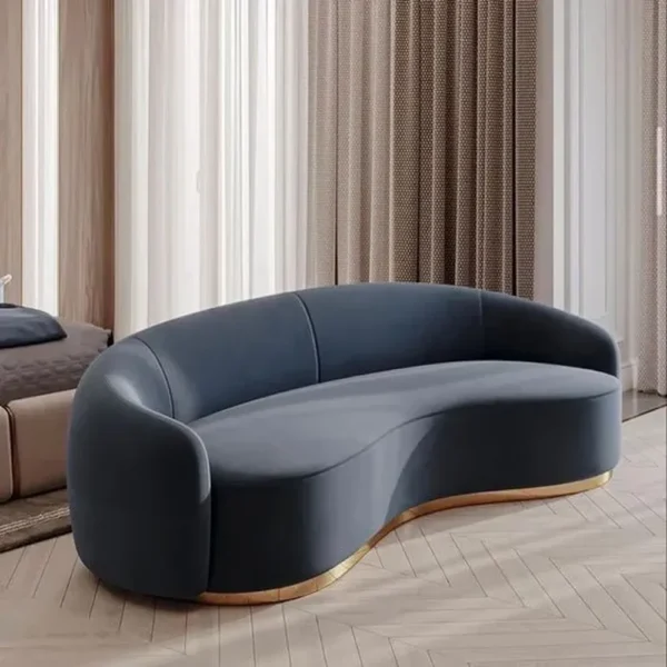 A true statement of modern luxury, this black velvet sofa features a dramatic kidney-shaped curve. The seamless design creates a fluid look, while the polished gold base provides a striking contrast. Perfect for sophisticated lounge areas or boutique waiting rooms.