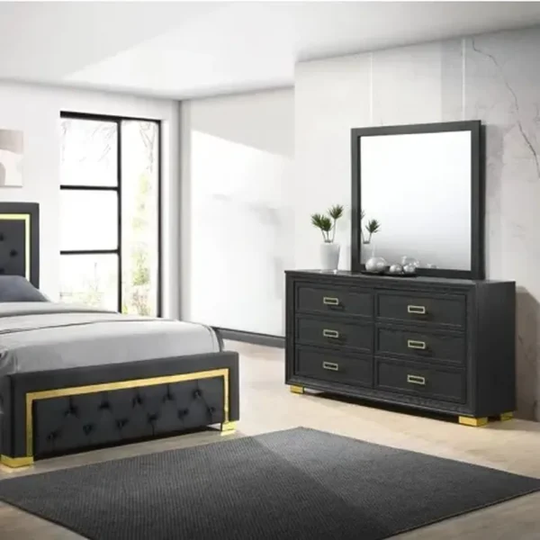 Elegant Black Velvet Tufted King Size Bed with Gold Trim Accents