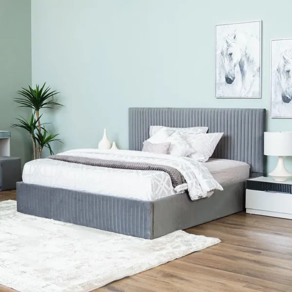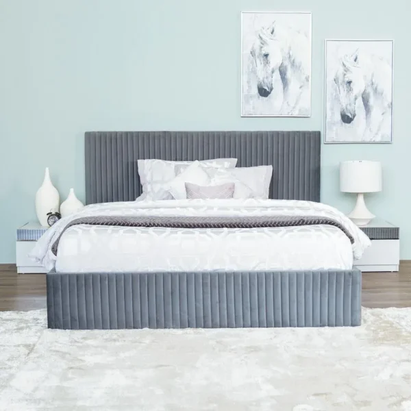 Elegant Grey Velvet Vertical Slat Bed with Matching Vanity Set