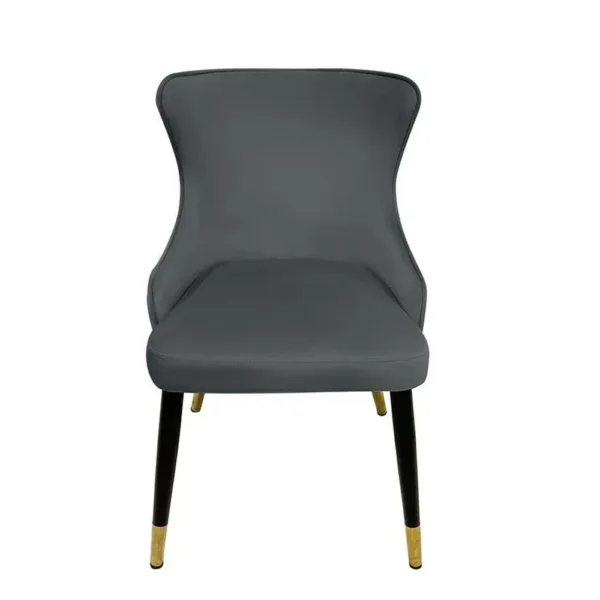 Elevate your dining experience with this sophisticated mid-century modern chair. Featuring a plush grey velvet finish and a distinctive wingback silhouette, it offers both comfort and style. The tapered black legs are finished with elegant gold tips, making it a perfect statement piece for any modern dining room.