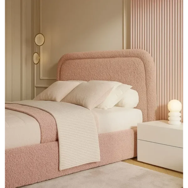 - Soft pink velvet upholstered bed frame