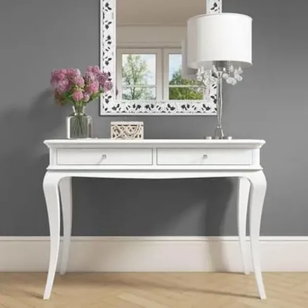 This exquisite console table draws inspiration from French Provincial design. With its elegant cabriole legs and smooth white finish, it serves as a beautiful focal point for an entryway or hallway. The two drawers feature minimalist knobs for a clean, luxury look.