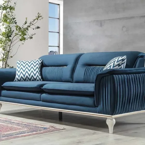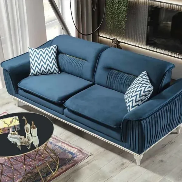 This teal blue velvet sofa is the epitome of modern glamour. The sides feature unique vertical pleating that adds depth and texture. Set on elegant white legs with a subtle gold base trim, this sofa is designed for those who want a high-fashion look in their living area.
