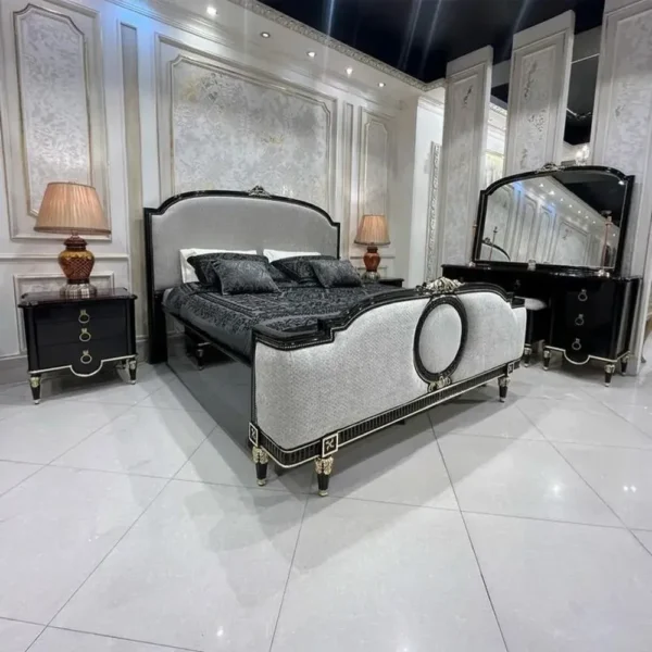 Elevate your bedroom to a palace-like setting with this luxurious deco bed. The frame is finished in a high-gloss black with intricate gold carvings on the headboard and footboard. The central panels are upholstered in a shimmering silver fabric, creating a high-contrast, regal aesthetic that defines opulence.