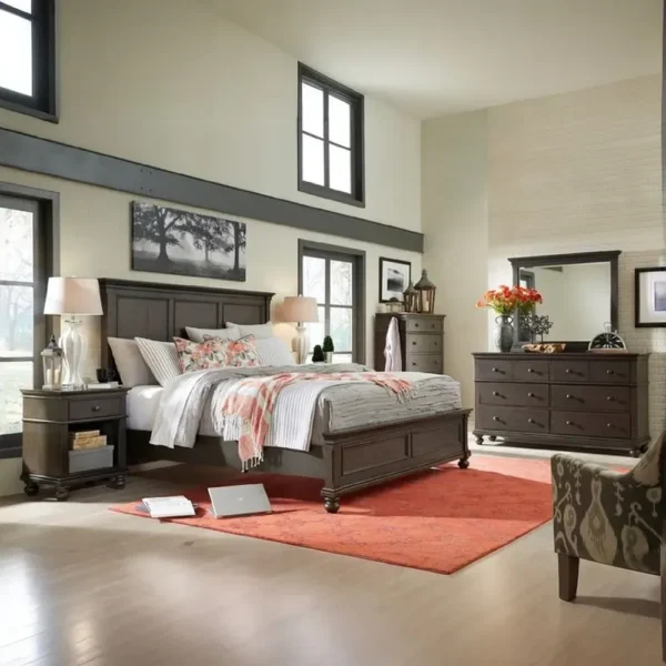 This grand traditional bed serves as the centerpiece of any master bedroom. Crafted from high-quality wood with a deep brown polish, the intricate paneling on the headboard and footboard reflects timeless craftsmanship and sophisticated style.