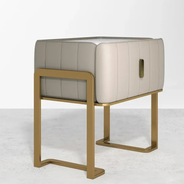 This side table bridges the gap between furniture and art. Wrapped in a vertical-stitched grey material and supported by a bold gold-finished sled base, it offers a unique texture. The flat top is ideal for showcasing designer lamps or decor, making it a perfect bedside or sofa-side companion.