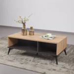 This functional center table combines the warmth of light brown oak with an industrial black base. Designed with two large open-access storage compartments, it’s perfect for keeping books and remotes organized. The sleek tapered legs provide a modern lift to the sturdy rectangular body.