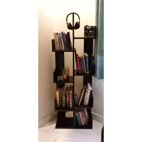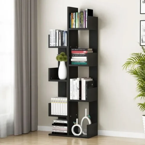 The KNIGHT Bookshelf features a striking asymmetrical silhouette that doubles as modern art. Crafted from high-quality synthetic wood, its vertical design maximizes storage in small footprints. Perfect for organizing a personal library or displaying curated home accents in a contemporary lounge or study.