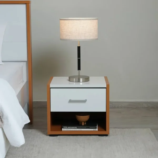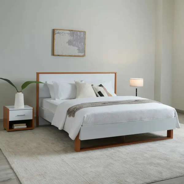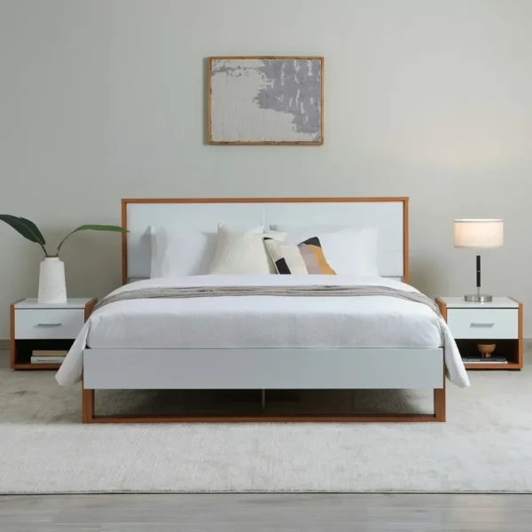 Designed for the modern minimalist, this platform bed features a sleek combination of white deco panels and brown wood-tone trim. The headboard is upholstered in high-quality white leather rite for a clean, architectural look. Its low-profile design and matching floating-style nightstands create an airy, contemporary feel in any master suite.