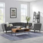 This modern masterpiece combines comfort with high-end aesthetics. Featuring deep vertical channel tufting and a rich chocolate brown velvet finish, it serves as a bold centerpiece for any contemporary living room. The sturdy frame is elevated by sleek black legs with gold accents.