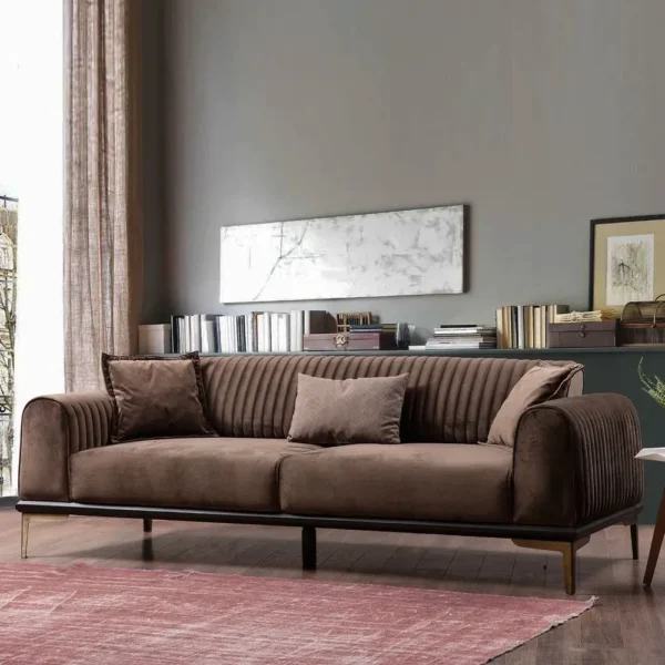 Luxurious Modern Brown Velvet Fabric Sofa with Vertical Channel Tufting and Gold Accents