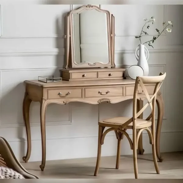 Indulge in the romance of French Provincial design with this luxury polished bed. The frame features graceful curves highlighted by delicate gold carvings and a soft white fabric inlay. This bed serves as a stunning centerpiece, bringing an air of timeless elegance and craftsmanship to a high-end master bedroom.