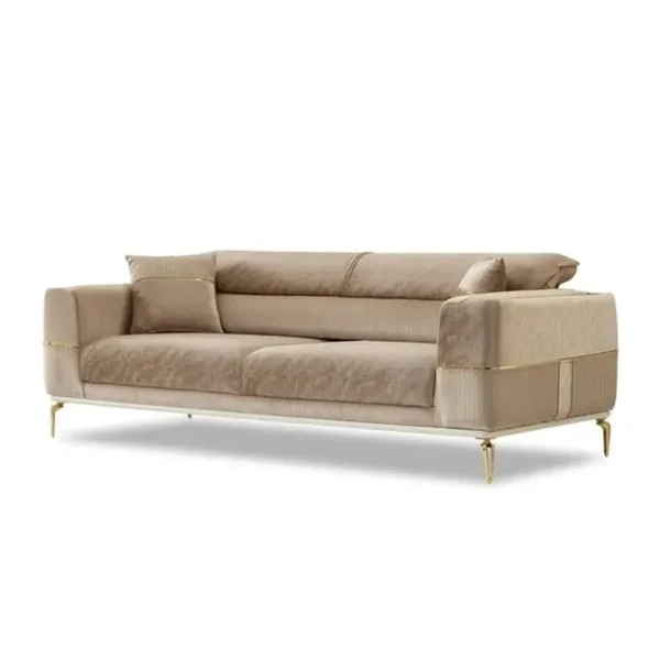 Experience the pinnacle of comfort with this grand Turkish-style sofa. Wrapped in soft beige velvet, it features unique gold trim detailing along the base and arms, offering a majestic seating experience for upscale living rooms.