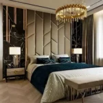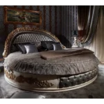 This Luxury Round Bed is the pinnacle of opulence. Featuring a massive circular footprint and a high-arched headboard, it is decorated with intricate gold floral carvings. The base and headboard are finished in premium grey tufted velvet for a royal sleeping experience.