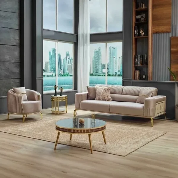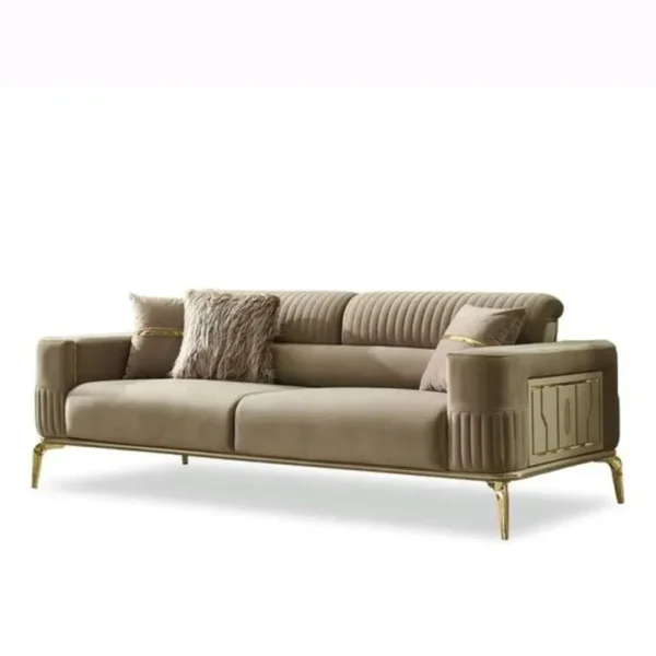 Transform your living area into a palace of comfort with this half-deco Turkish sofa set. The beige velvet fabric is soft to the touch, complemented by intricate vertical stitching and glamorous gold-finished legs. This set is designed for high-end luxury and maximum aesthetic appeal.