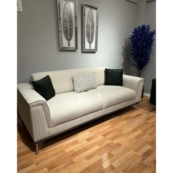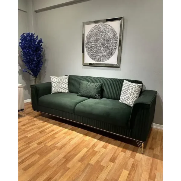 This luxurious Turkish-style sofa set features rich emerald green velvet with intricate vertical stitching. The gold metallic legs add a touch of opulence, making it an ideal choice for high-end, sophisticated living spaces.
