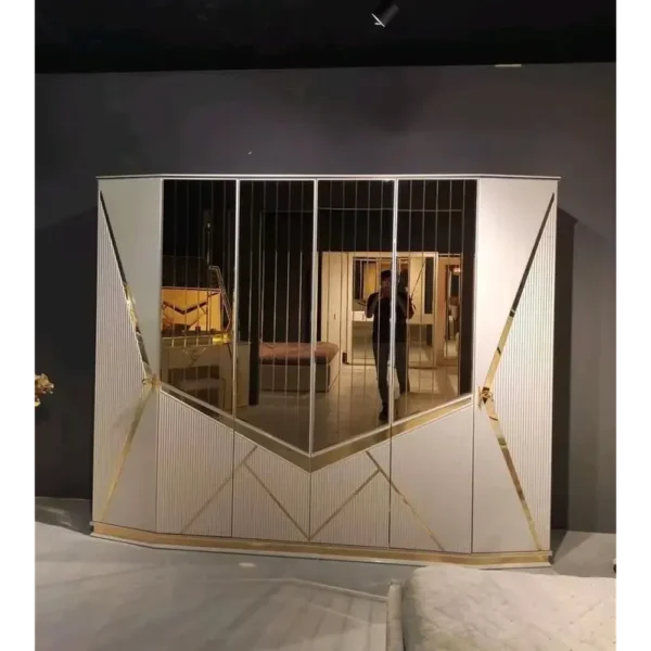 Designed for a royal feel, this Turkish bed features a striking “V” shaped geometric headboard design. The combination of reflective mirrors, gold metal, and soft velvet makes it a bold statement piece for any luxury interior.