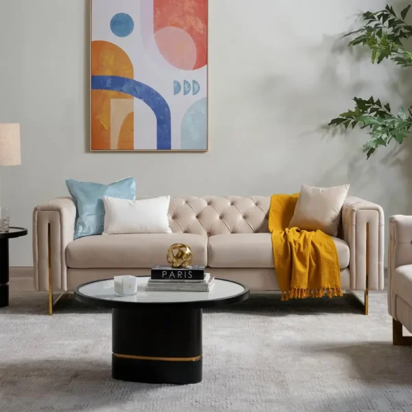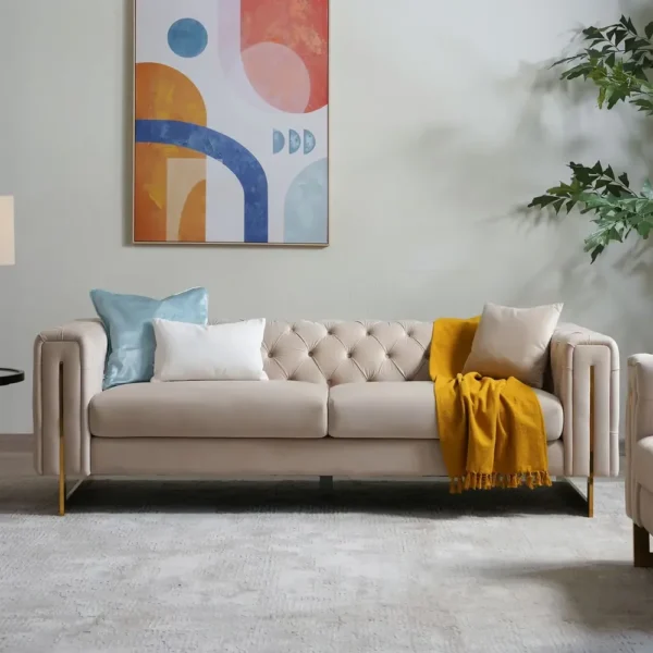 This stunning Fabric Sofa blends classic elegance with modern flair. Upholstered in premium beige velvet, the backrest features deep diamond button tufting for a timeless look. The square arms are uniquely accented with inset vertical gold metal bars that flow into the sleek gold legs. Spacious and incredibly soft, this sofa adds a high-end, boutique feel to any modern living space.