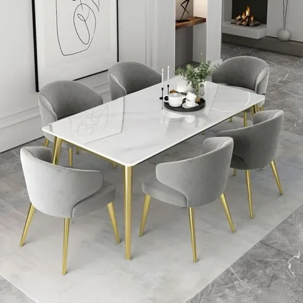 Bring the feeling of a high-end bistro into your home with this stunning dining set. The table features a crisp white marble-style surface that is easy to clean and visually striking. It is surrounded by six ergonomic dining chairs upholstered in premium grey velvet with matching gold-finished legs for a cohesive, glamorous look.