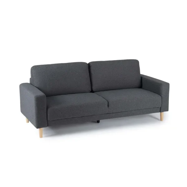 This sophisticated fabric sofa blends simple lines with high-quality comfort. Featuring a durable jute-textured upholstery in a deep charcoal finish, it stands on elegant natural wood legs that provide a sturdy, mid-century modern aesthetic. Ideal for compact living spaces or modern offices.