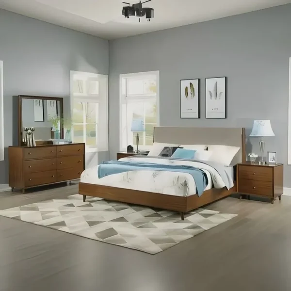 Mid-Century Modern Light Brown Wood Bed with Gray Padded Headboard