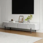 This modern LCD floor unit prioritizes clean lines and premium materials. Featuring a bright white glossy body with rounded corners, the unit is topped with a sophisticated marble-patterned surface. Supported by slim, architectural slate legs, it provides a low-profile, floating appearance for modern interiors.