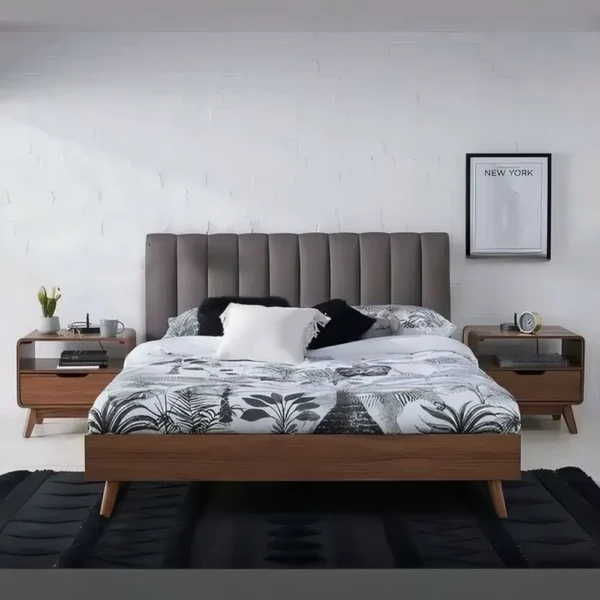 This minimalist bed frame brings a serene, organic feel to the bedroom. The light brown wood grain is paired with a sophisticated grey jute-fabric headboard featuring vertical stitching. The low-profile platform design creates an airy, modern atmosphere perfect for contemporary homes.
