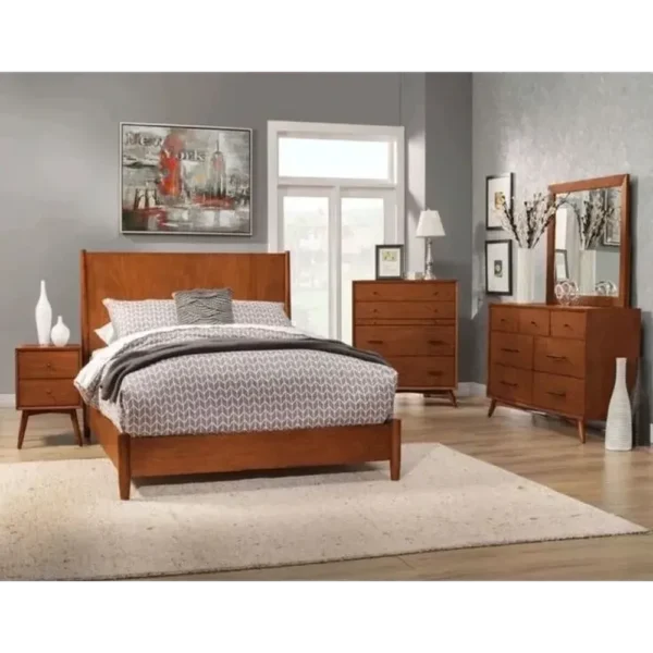 This bed celebrates the beauty of natural wood grain through a clean, modern lens. The light brown polish highlights the wood’s texture, while the minimalist headboard and tapered legs offer a nod to mid-century aesthetics. It’s a sturdy, stylish centerpiece for a modern bedroom.