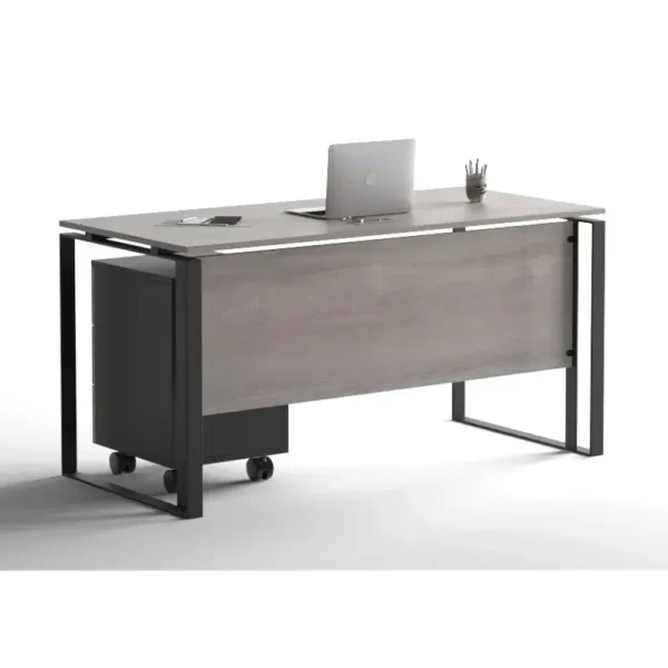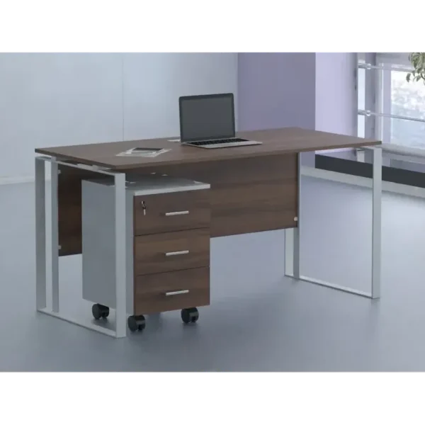This One Person Workstation is the epitome of modern minimalism. It features a broad, dark wood desktop supported by a stylish silver metal frame. For ultimate flexibility, it includes a matching three-drawer mobile pedestal on casters, allowing you to position your storage wherever it’s most convenient. Perfect for clean, modern office environments.