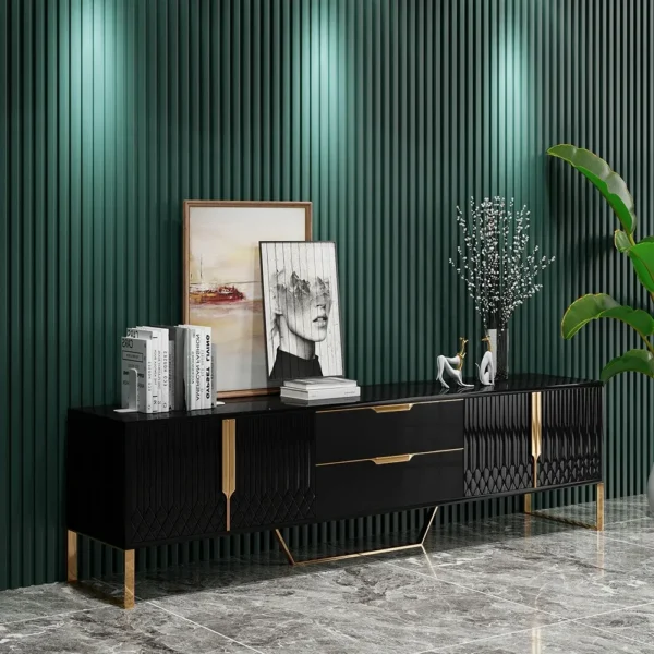 A sophisticated addition to your living space, this LCD unit features a dramatic black fluted texture and a sturdy gold-finished base. The marble-top surface provides a premium platform for your television and decorative accents.