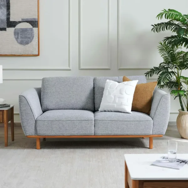 A perfect blend of comfort and style, this modern fabric sofa features a cool blue-grey jute upholstery. Supported by a solid wood frame with a natural brown polish, its clean lines and minimalist aesthetic make it a versatile piece for any contemporary living room or studio.