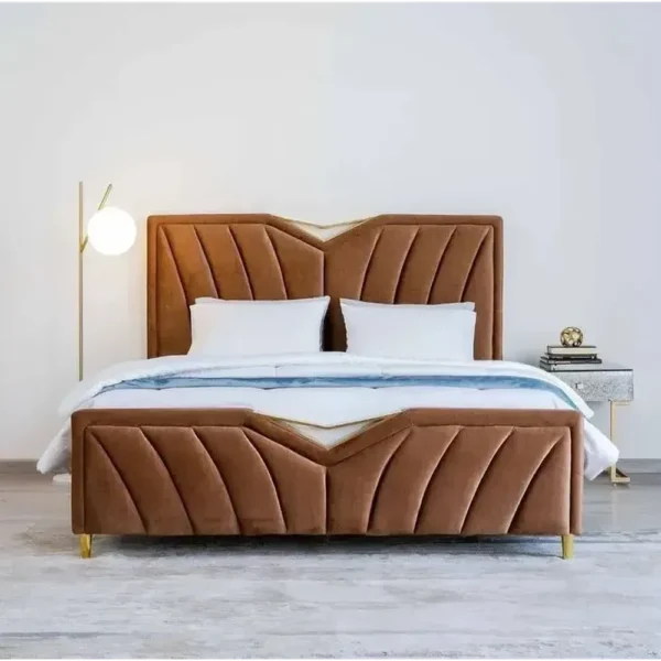 This bed features a striking fanned headboard with geometric “V” patterns. The warm brown velvet is accented with thin blue fabric lines and gold trim for a high-end designer look. The polished gold legs complete this modern masterpiece, making it the focal point of any room.