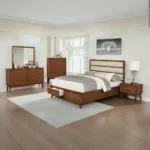 This comprehensive bedroom suite balances the warmth of dark brown wood with the brightness of white leatherette padding. The headboard and matching bench feature clean horizontal tufting for a structured, modern look. With a spacious dresser and tall chest included, this set provides a polished and organized atmosphere for a large master bedroom.