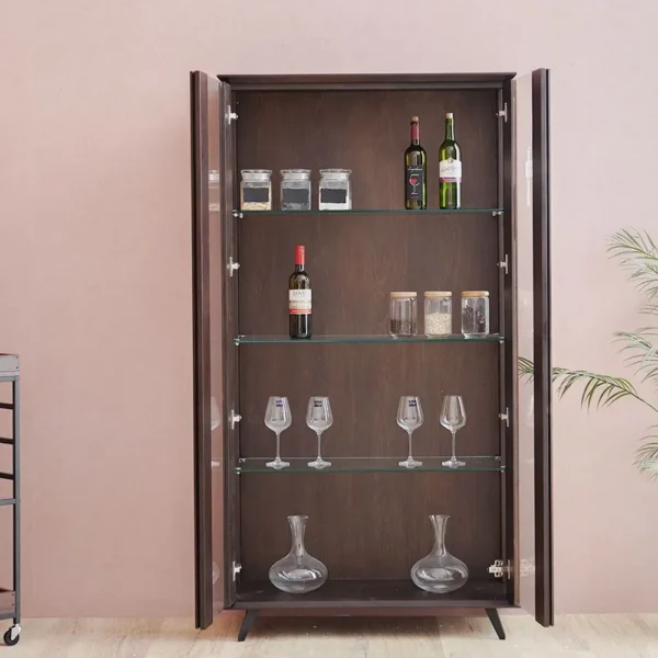 Showcase your collectibles and glassware in this sophisticated display cabinet. The dark brown polished wood frame provides a warm, classic look, while the glass panels and shelves allow for maximum visibility. Its elevated slim legs give it a modern, light appearance.