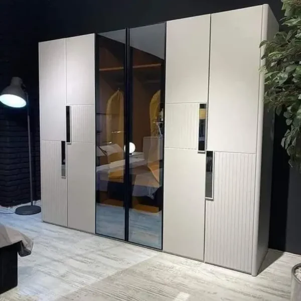 Transform your dressing area with this striking modern cupboard. The outer doors feature a crisp white finish with vertical ribbed textures, while the central doors are clad in black tinted mirrors. This large-scale storage solution offers a sleek, built-in look with high-contrast contemporary appeal.
