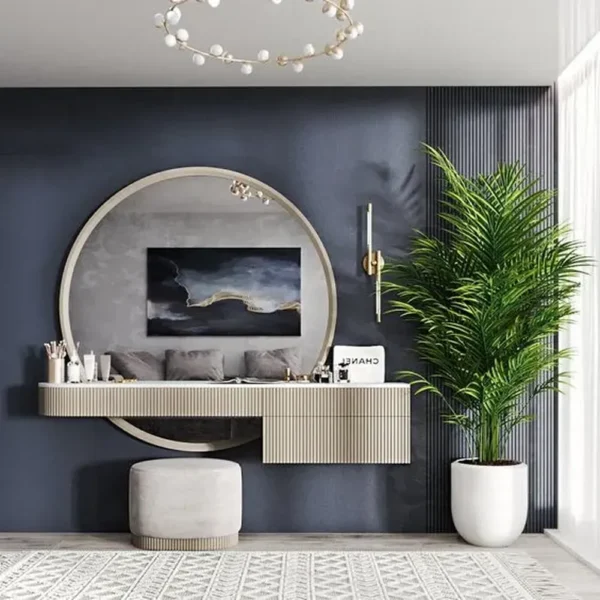 Modern Floating Dressing Table with Oversized Circular Mirror and Fluted Detail