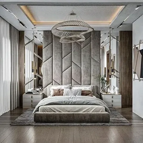 Transform your bedroom into a high-end hotel suite with this modern wall bed. The design features floor-to-ceiling padded panels in a soft grey velvet, arranged in a striking geometric pattern. It creates a seamless, luxurious focal point that replaces the need for a traditional headboard.