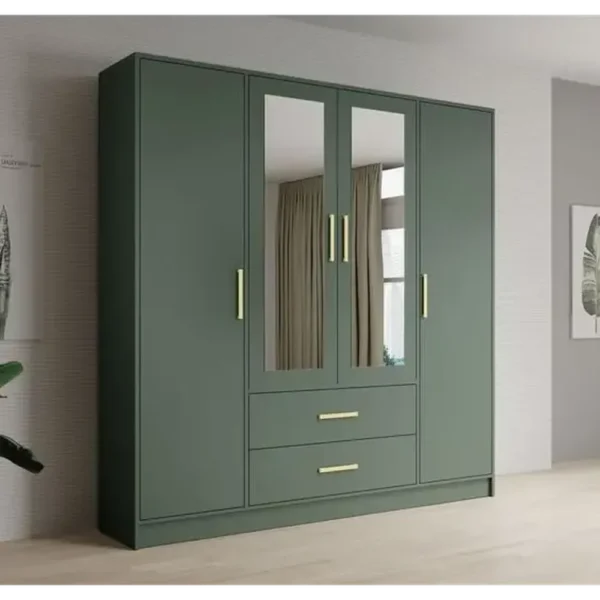 Modern Forest Green Four-Door Wardrobe with Mirrored Panels