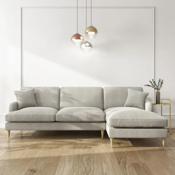 This modern L-shaped sectional is the perfect blend of comfort and style. Upholstered in a versatile grey fabric, it features sleek gold legs that elevate the design. The chaise lounge offers the perfect spot for relaxation, making it ideal for family movie nights or entertaining guests.