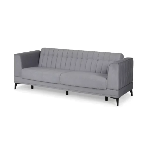This sophisticated fabric sofa is a masterclass in modern living room design. The backrest features deep button tufting for a tailored look, while the thick seat cushions provide lasting comfort. Supported by minimalist black legs, this grey jute sofa fits perfectly into both professional and cozy domestic spaces.
