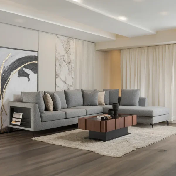 Modern L-Shaped Grey Fabric Sectional Sofa with Built-in Bookcase Arm