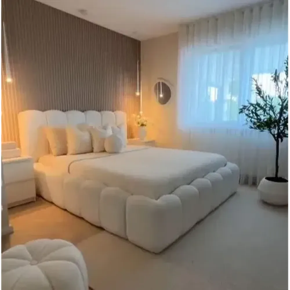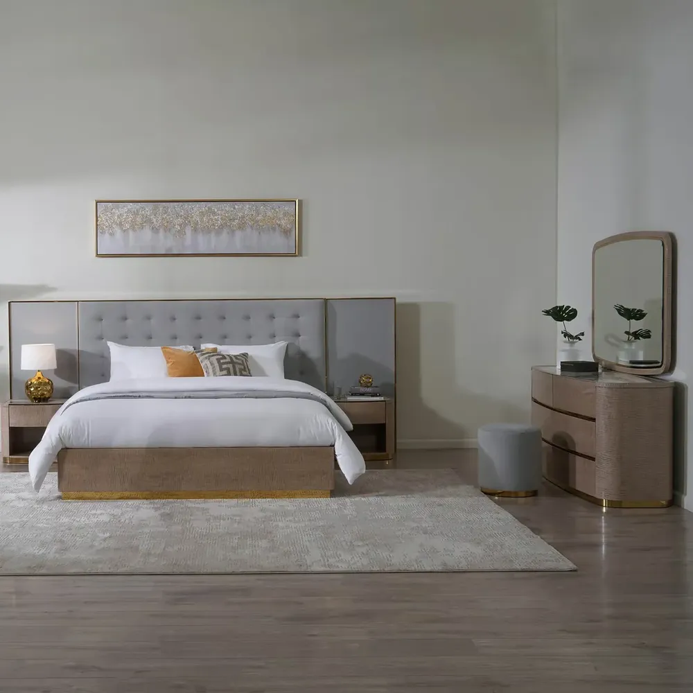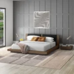 This modern platform bed combines functionality with contemporary aesthetics. Featuring a unique integrated headboard that extends into floating nightstands, it offers a seamless look for any bedroom. The dark charcoal upholstered center provides a soft backrest, perfectly contrasting the natural light brown wood grains and black accents.