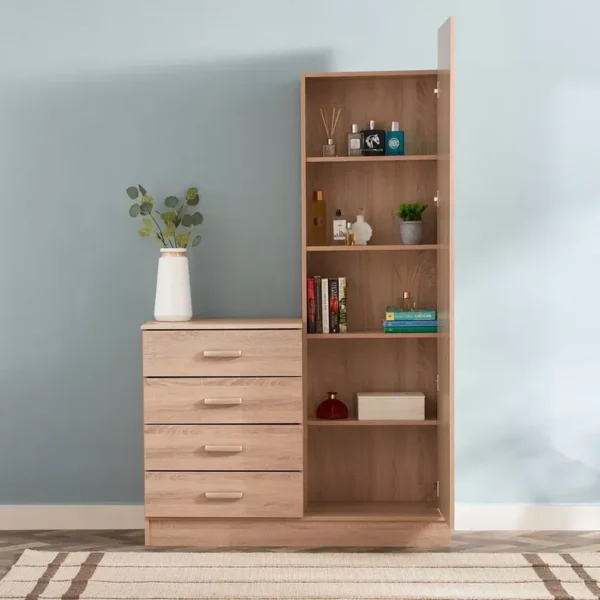 This space-saving dressing unit combines a tall, full-length mirror with a functional four-drawer chest. Finished in a beautiful light brown laminate with natural wood textures, it provides an organized solution for your morning routine while enhancing the light in your bedroom.