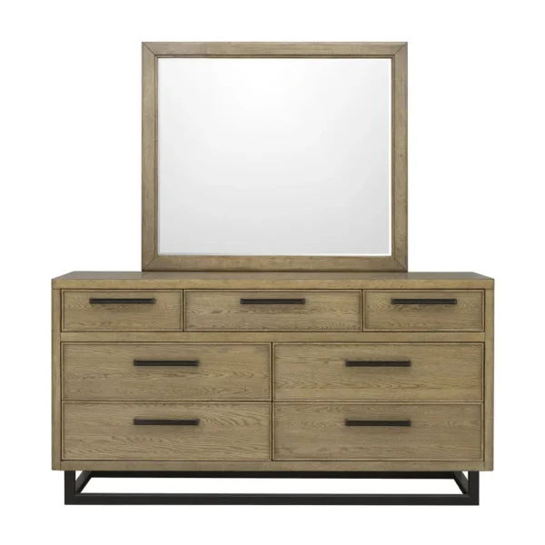 Combining industrial elements with warm wood tones, this bed set features a unique slatted headboard and a durable black metal base. The matching dresser provides extensive storage with a clean, hardware-free aesthetic.